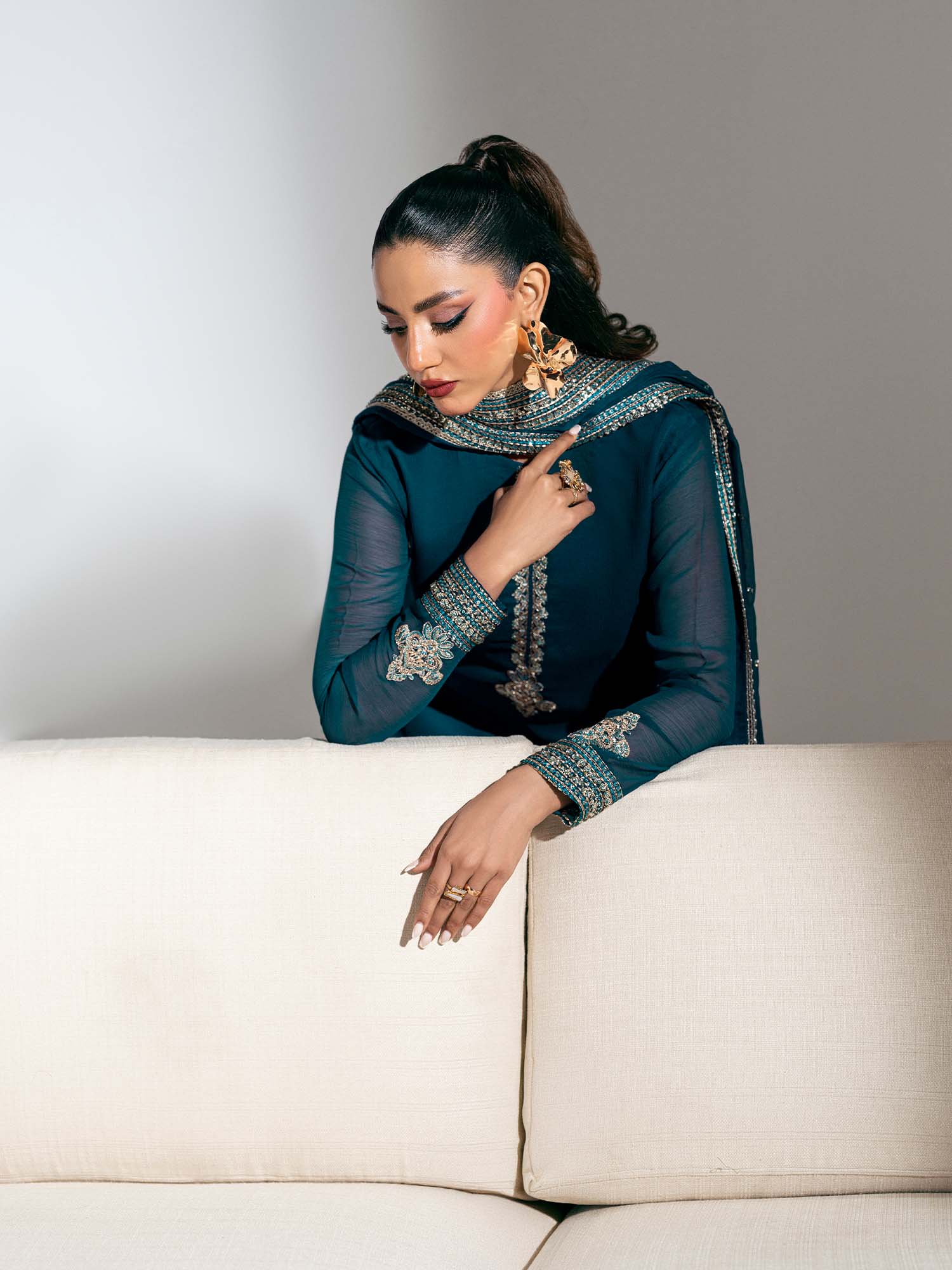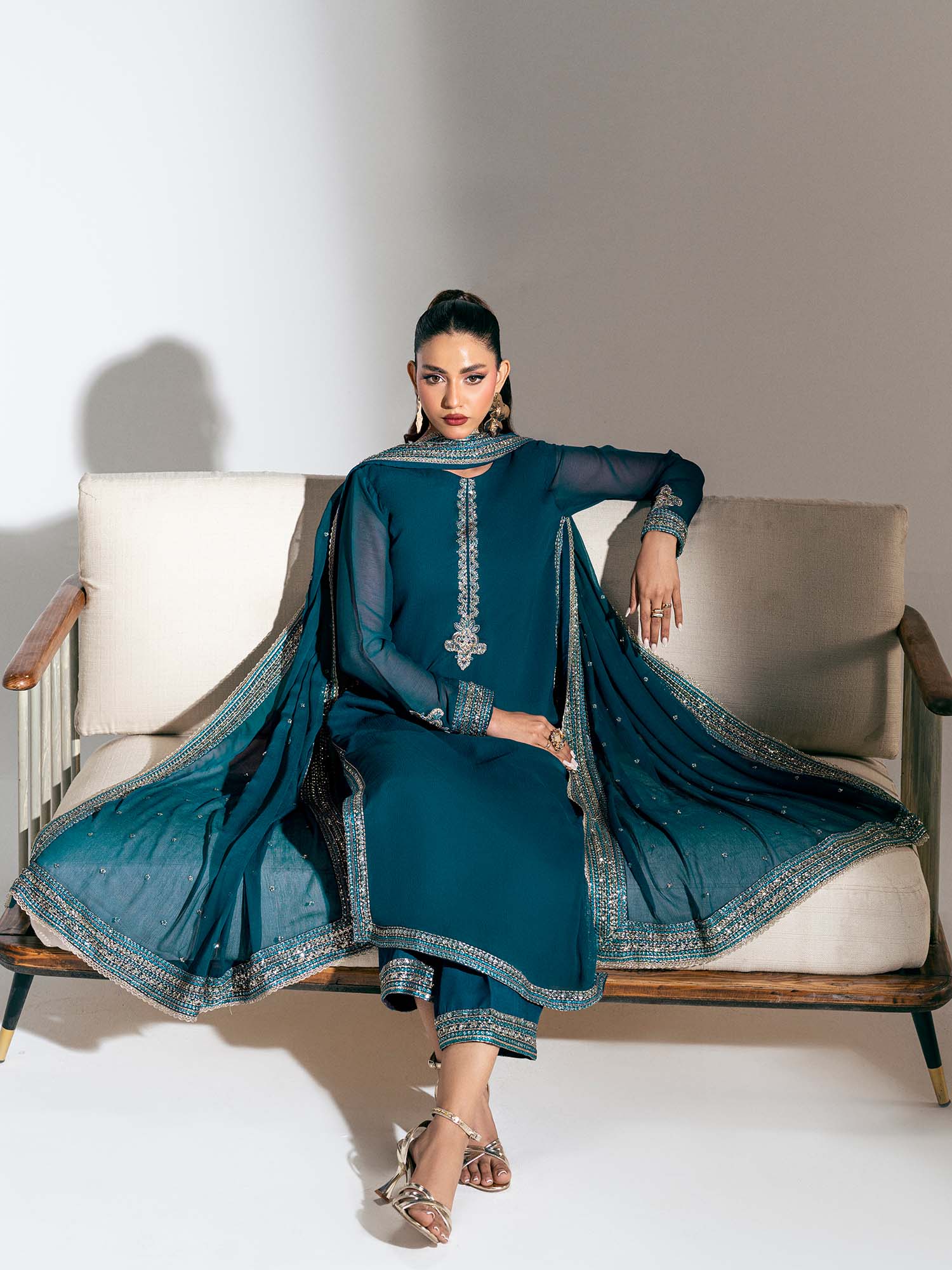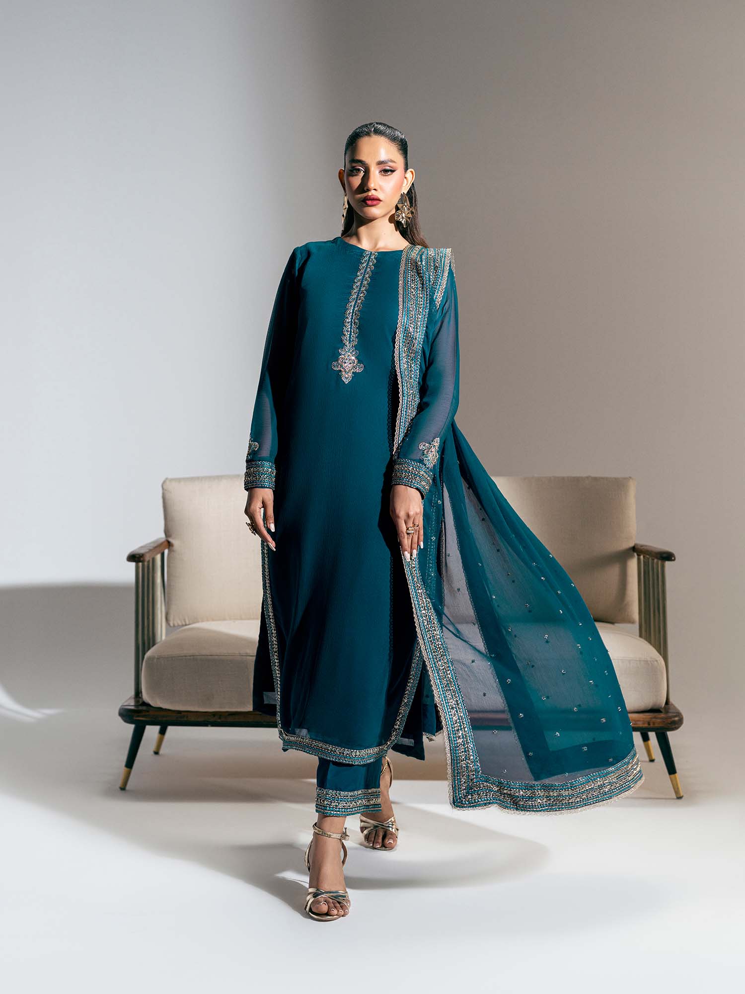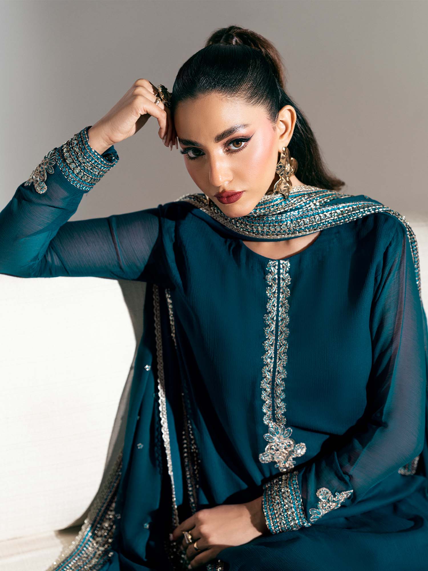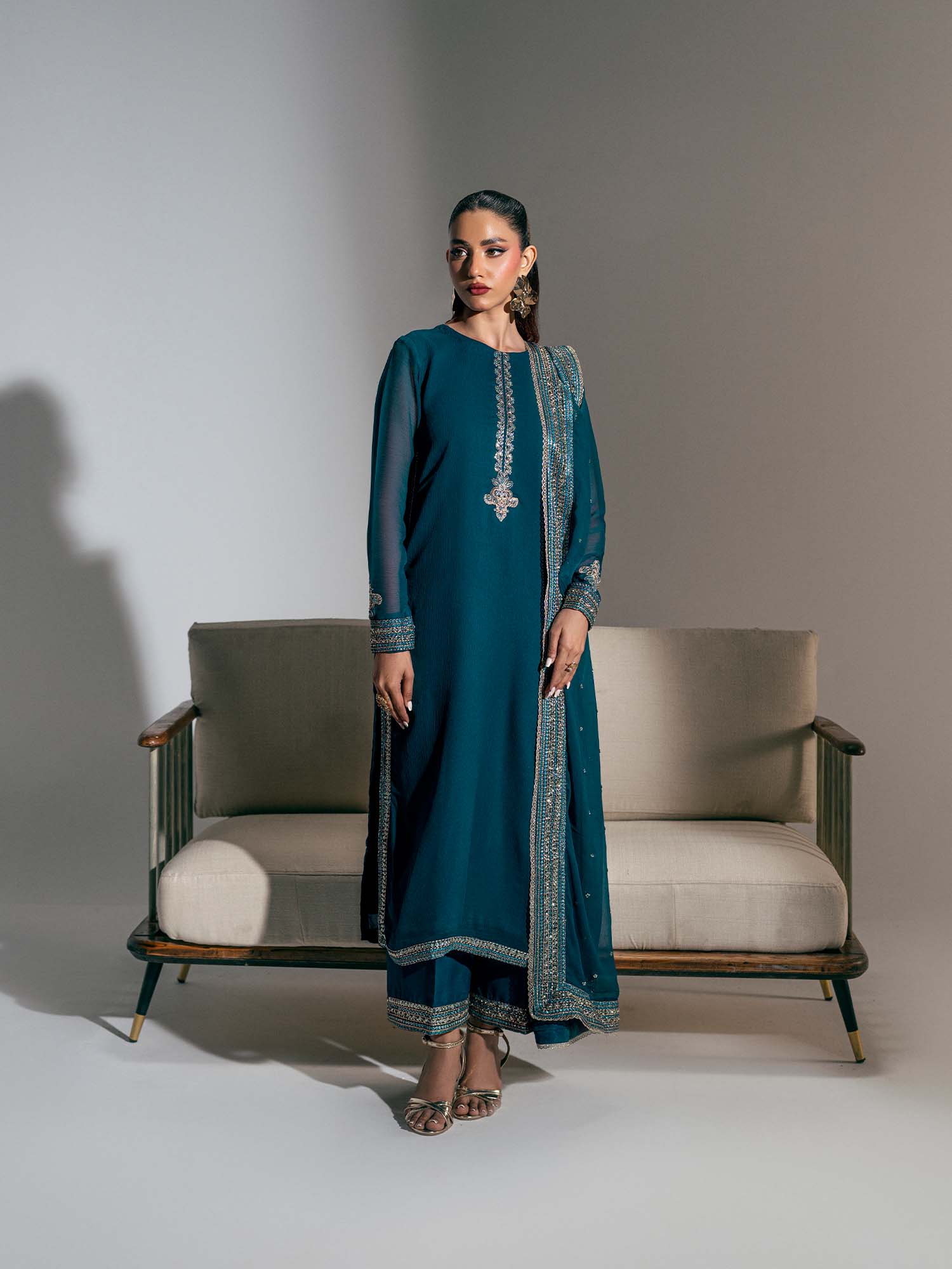 This stunning zinc blue ensemble is a testament to refined elegance, featuring intricate embroidery throughout, in shades of silver and blue that enhance its regal appeal.
