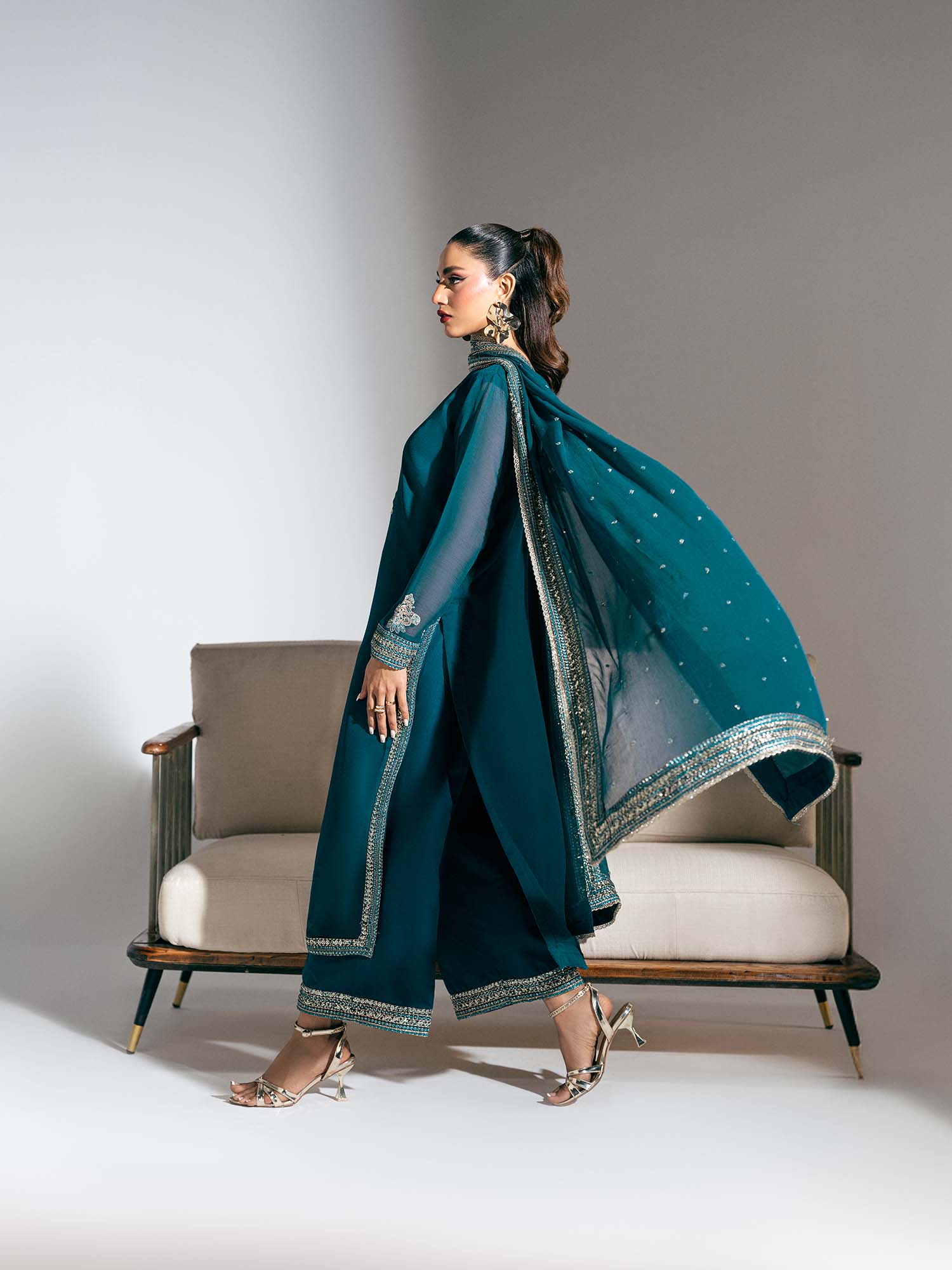 The sheer sleeves carry subtle embroidered detailing along with chaak- daaman of the dress, while the wide palazzo-style trousers create a statement of effortless sophistication.
